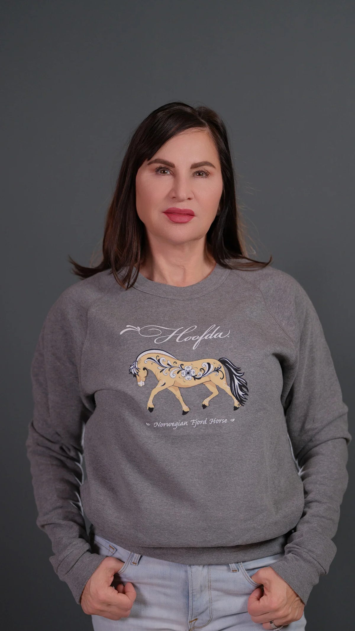 Norwegian "Grey" Fjord Horse V-neck Grey with Rosemaling